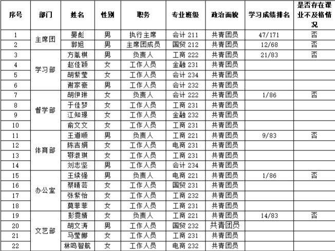 经济管理系员工会严格遵守《经济管理系员工会章程》,明确成员遴选条件,所有成员均思想政治素质高、学习成绩优良,无课业不及格情况,且综合成绩排名位列专业前30%。具体情况如下表所示: