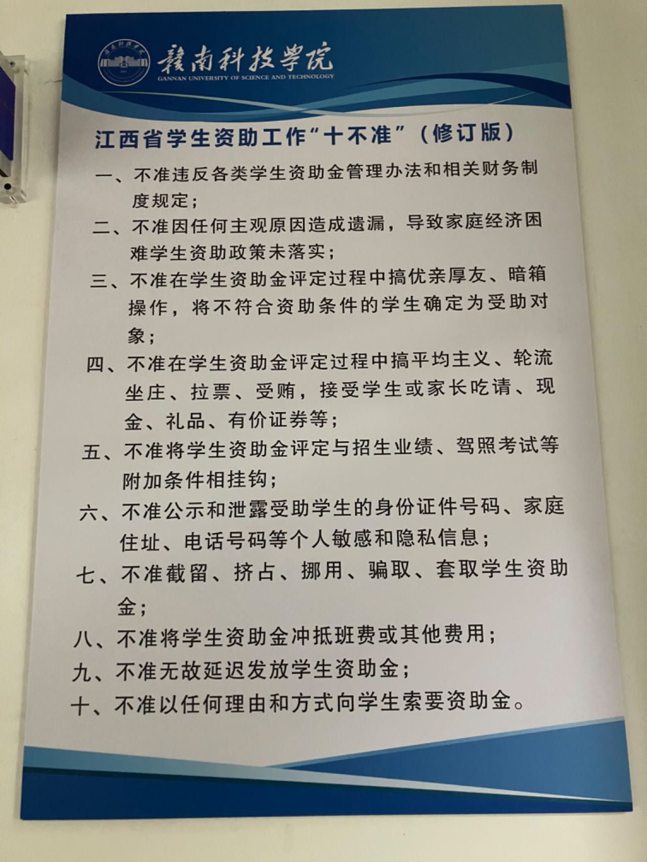 在新民楼经管公司办公区域的显眼位置,悬挂了江西省员工资助工作“十不准”宣传板,通过图文并茂的形式,提醒广大师生在资助工作中必须严格遵守“十不准”规定,确保资助工作的公平、公正、公开。