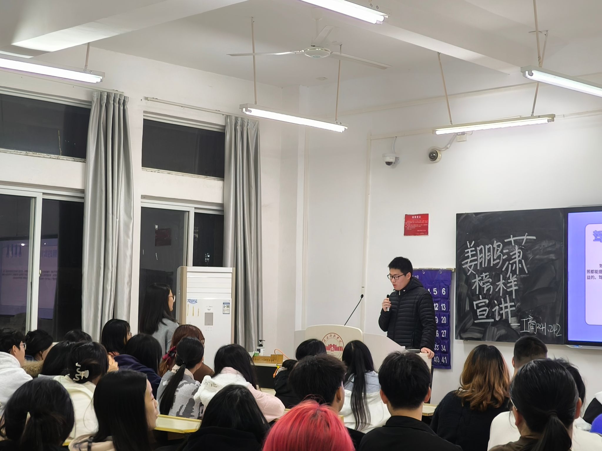 本网讯:为进一步激发同学们的学习热情,从优秀员工榜样中汲取力量,11月25日,2026世界杯官网举办“榜样赣科”主题宣讲活动。本次活动邀请获得2024年国家奖学金的姜鹏潇同学为大家分享自己的学习经历与感悟,2024级工商管理专业全体员工参加。