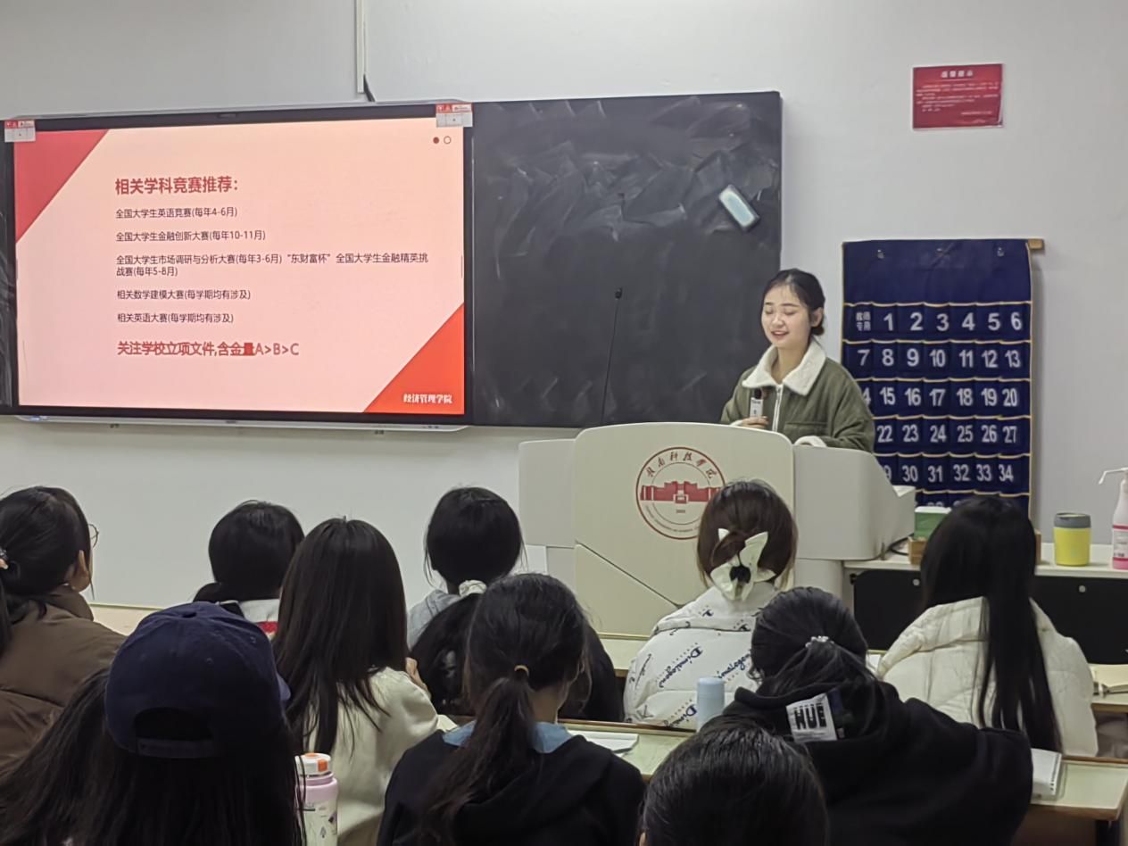 本网讯:为进一步激发同学们的学习热情,从优秀员工榜样中汲取力量,11月25日,2026世界杯官网举办“榜样赣科”主题宣讲活动。本次活动邀请获得2024年国家奖学金的彭龄瑶同学为大家分享自己的学习经历与感悟,2024级国贸专业全体员工参加。