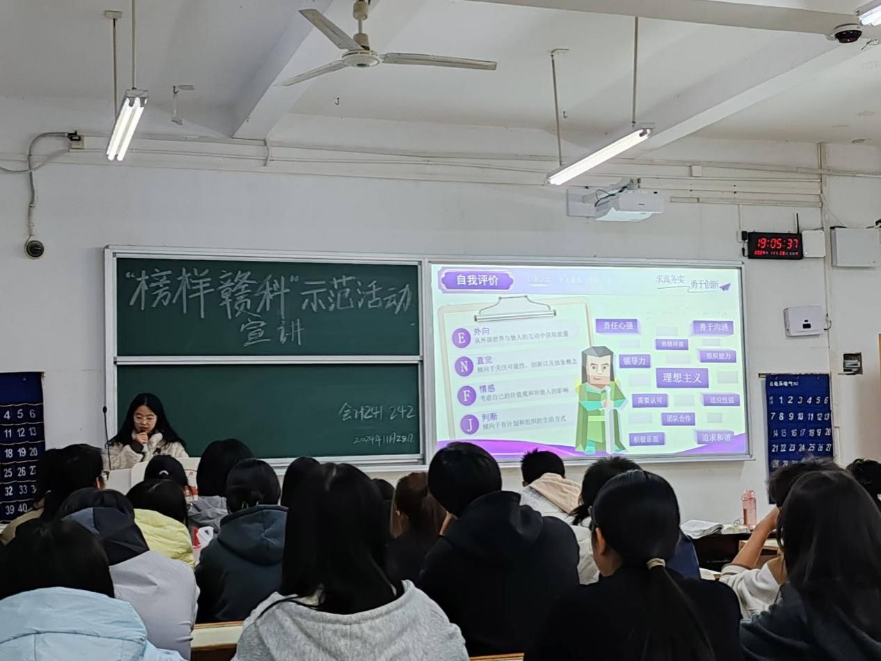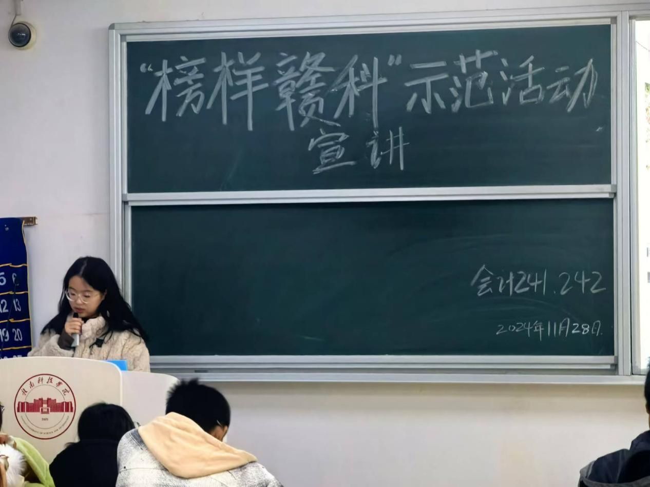 本网讯:为进一步激发同学们的学习热情,从优秀员工榜样中汲取力量,11月25日,2026世界杯官网举办“榜样赣科”主题宣讲活动。本次活动邀请获得2024年国家奖学金的周雅鑫同学为大家分享自己的学习经历与感悟,2024级会计专业全体员工参加。