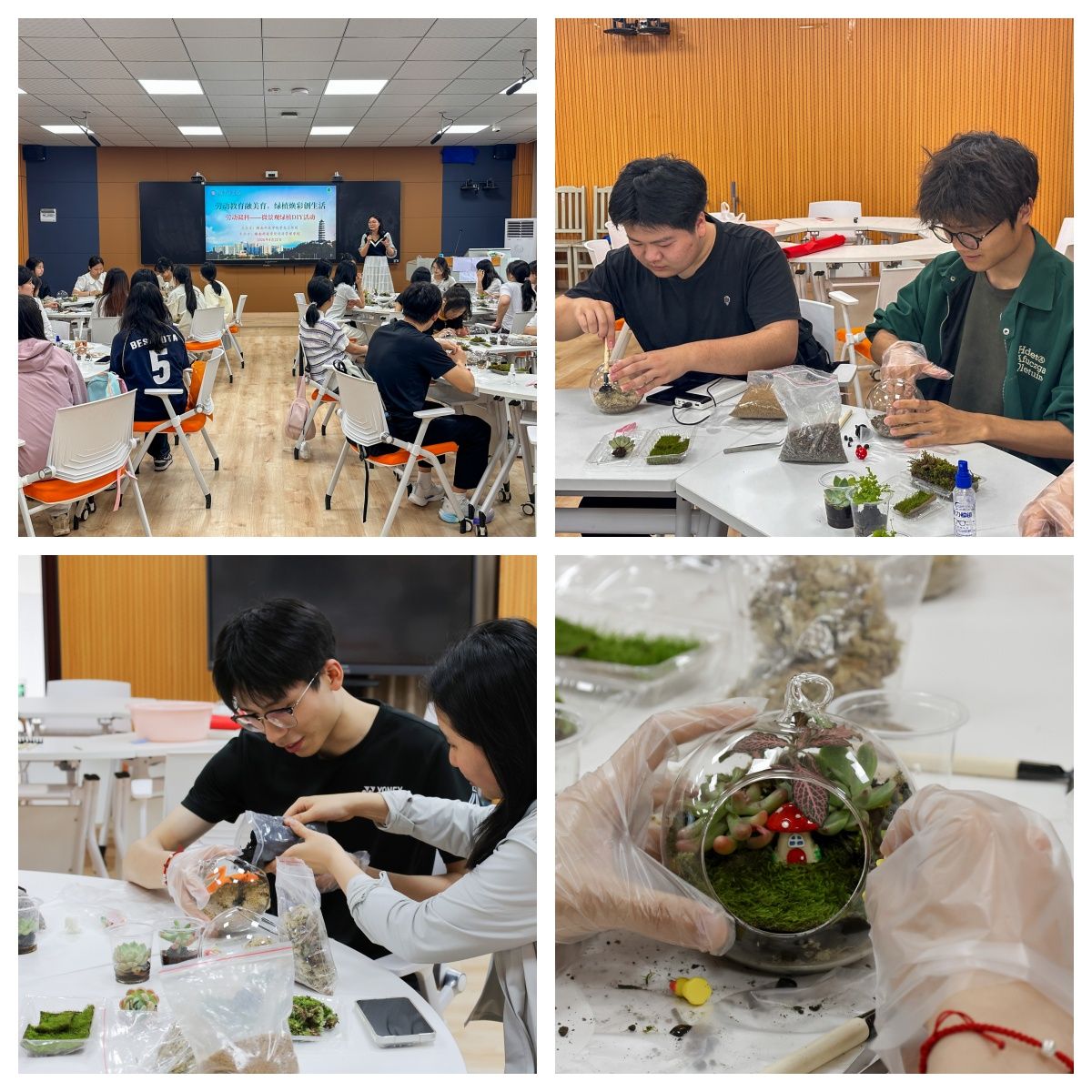 制作过程中,员工们分成小组,积极动手实践。同学们化身“自然设计师”,将绿意盎然的苔藓、形态各异的多肉与精巧的装饰品巧妙搭配,精心打造出属于自己的微观世界。一方方玻璃容器中,绿意蔓延、春色跃动,既有自然的清新,又融入了独特的艺术气息。大家相互交流创作思路,分享栽培心得,现场气氛轻松愉悦。会计231班方可嘉同学表示:“通过此次活动,我真正感受到了微景观以方寸之地浓缩出的自然意趣。我不仅需要细致地模拟出植物生长的环境,还需要构思独具特色的布局与搭配,让我解锁新技能的同时,身心也得到了充分放松!”