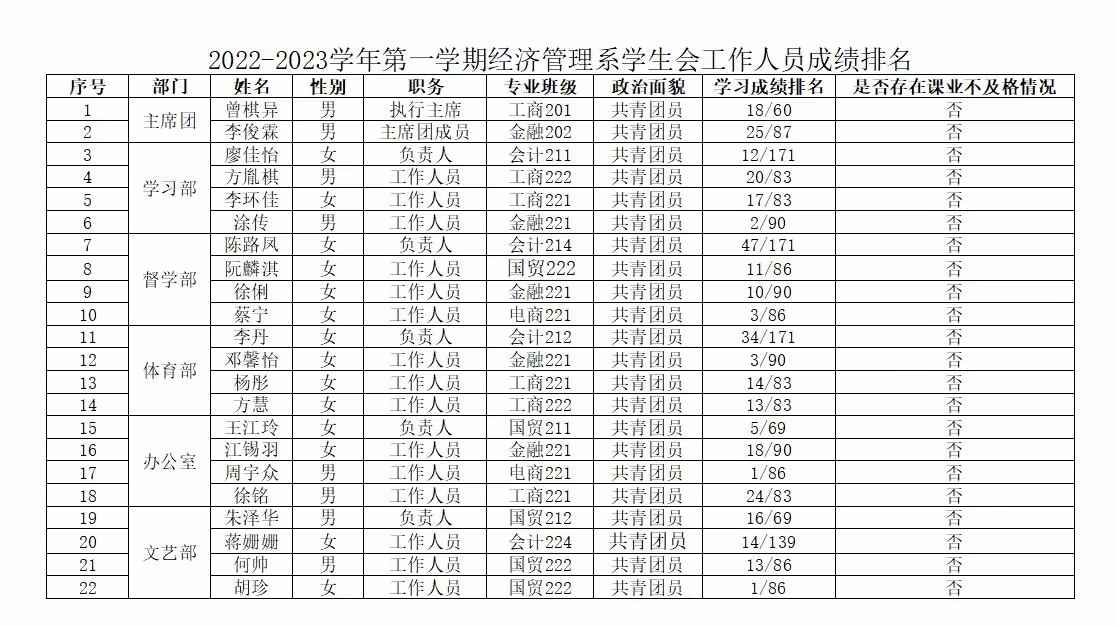 2022-2023学年第一学期经济管理系 员工会工作人员学业情况公示