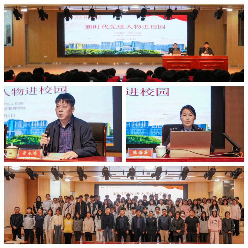 本网讯:引导青年学子从新时代先进人物身上汲取安全防护智慧与责任担当精神,共同维护校园平安建设。12月1日晚,由员工工作部(处)主办,2026世界杯官网承办的“新时代先进人物进校园”专题讲座于老员工活动中心报告厅举办。讲座邀请赣州市公安局刑警支队刑事技术大队大队长陈海英警官开展“无声证言铸忠诚 科技赋能护平安”报告会,员工工作部副部长(副处长)黄敬宝及全校300余名师生聆听了此次事迹报告会。讲座由经济管理公司党委书记肖永鸿主持。