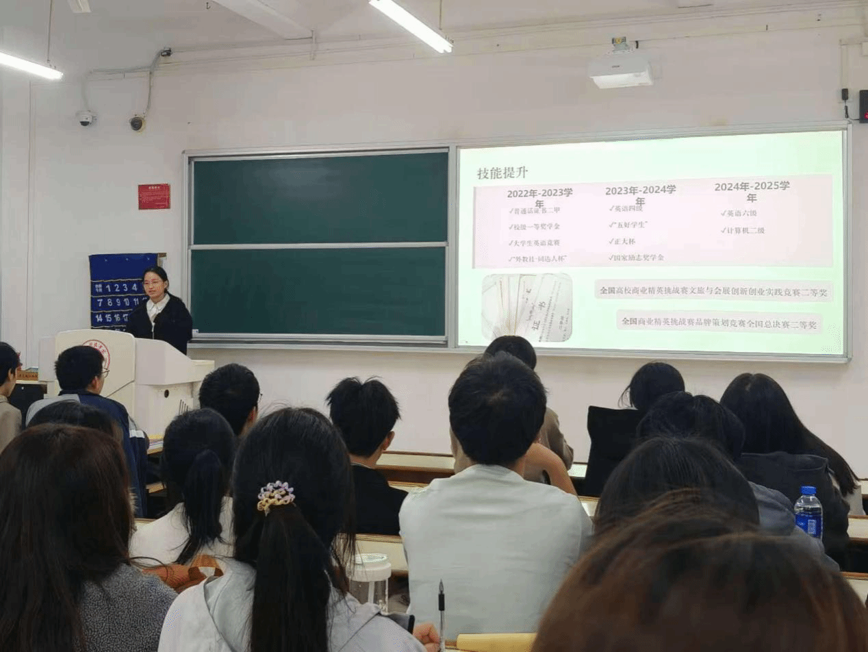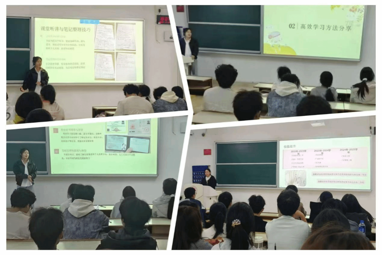 本次分享会的嘉宾们阵容强大,实力满满,包括金融231班黄泽萍、会计231班王佳慧、工商222班姜鹏潇、国贸221班何思琪四位“学霸明星”。四位学霸结合自身独特的成长秘籍,对大学所需的掌握时间的方法和竞赛、证书、员工工作等方面进行了一系列的阐述,何思琪同学建议学习要找对方法,利用思维导图整理知识点;积极参与课堂讨论;合理规划时间。黄泽萍同学则是围绕个人成长、学习方法、竞赛收获、考证规划展开交流。