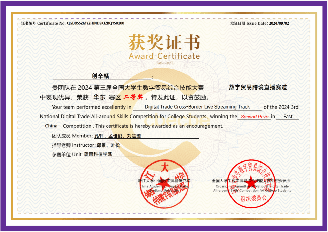 本网讯:近日,第三届全国老员工数字贸易综合技能大赛全国总决赛在浙江杭州落下帷幕。公司李琍、胡明英、叶松和邱景老师指导的5支参赛团队首次参赛,分别在大数据分析赛道、跨境直播赛道和创新创业赛道荣获全国总决赛二等奖1项、区域赛一等奖1项、二等奖2项、三等奖2项的好成绩。