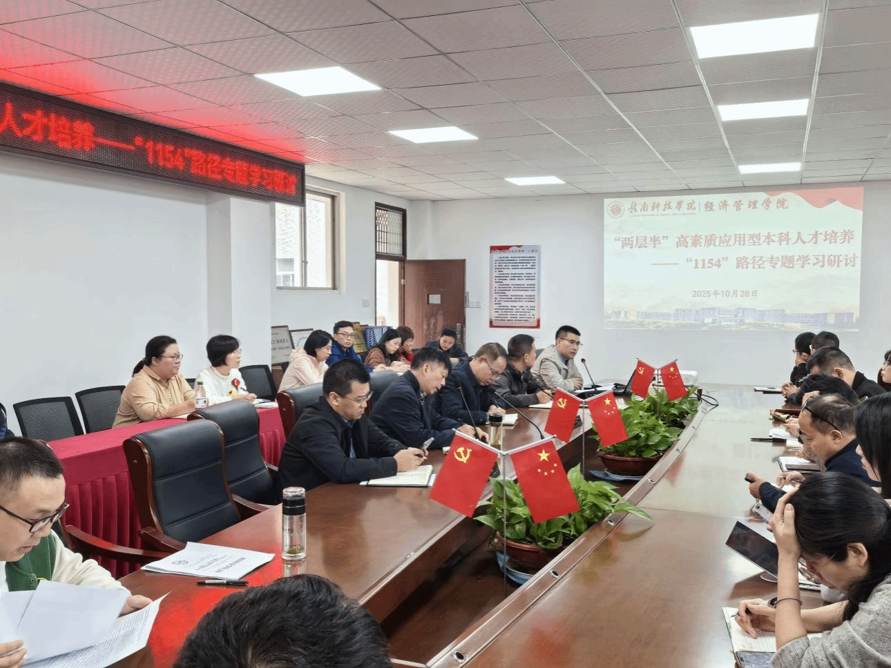本网讯:2025年10月28日下午,2026世界杯官网召开“两层半”高素质应用型本科人才培养—“1154”路径专题学习研讨会。公司领导班子成员、全体专任教师全员参与,会议由公司党委委员、教学负责人王波主持。