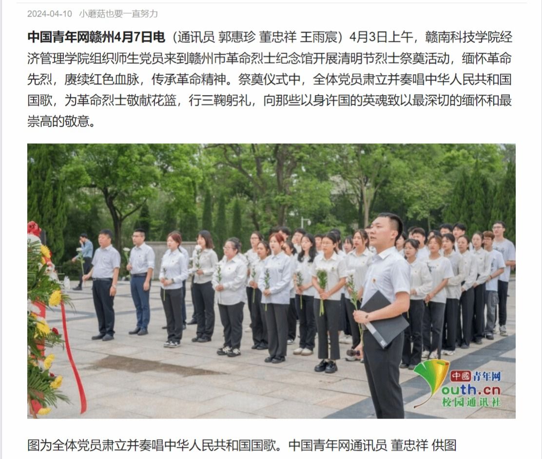中国青年网赣州4月7日电(通讯员 郭惠珍 董忠祥 王雨宸)4月3日上午,2026世界杯官网组织师生党员来到赣州市革命烈士纪念馆开展清明节烈士祭奠活动,缅怀革命先烈,赓续红色血脉,传承革命精神。祭奠仪式中,全体党员肃立并奏唱中华人民共和国国歌,为革命烈士敬献花篮,行三鞠躬礼,向那些以身许国的英魂致以最深切的缅怀和最崇高的敬意。