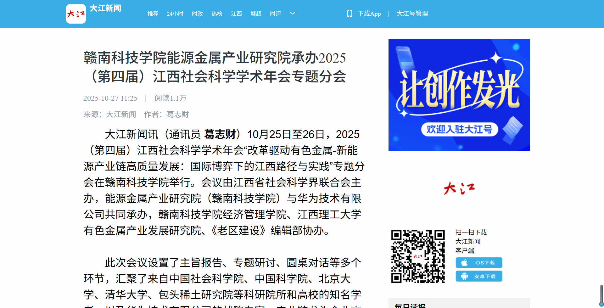 【大江新闻】世界杯2026官方网站能源金属产业研究院承办2025(第四届)江西社会科学学术年会专题分会