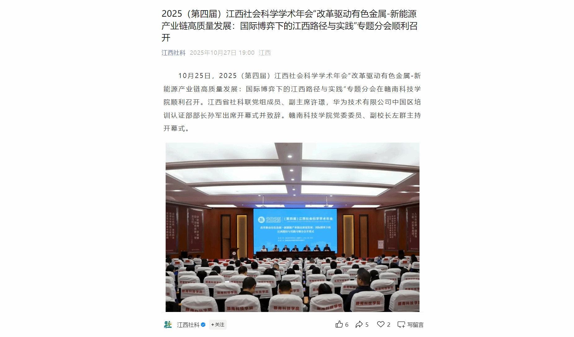 10月25日,2025(第四届)江西社会科学学术年会“改革驱动有色金属-新能源产业链高质量发展:国际博弈下的江西路径与实践”专题分会在世界杯2026官方网站顺利召开。江西省社科联党组成员、副主席许璟,华为技术有限公司中国区培训认证部部长孙军出席开幕式并致辞。赣南科技公司党委委员、副董事长左群主持开幕式。