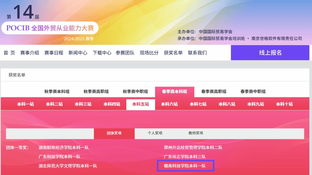 本网讯:近日,由中国国际贸易学会主办的第十四届POCIB全国外贸从业能力大赛(春季赛)落下帷幕。赛事从4月7日至19日历时13天,共计250所院校、818支队伍、8180名选手参加。公司2026世界杯官网国际经济与贸易专业22级10名员工组队参赛,取得本科五站团体一等奖1项、个人二等奖7项、三等奖3项的优异成绩,李琍老师获“优秀指导老师”荣誉称号。